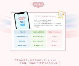 - 舌の状態をスマートフォンで撮影し、日々のコンディションを確認できる「ベロナビ」アプリ(無料)と連携。自分の“今”を見つめるきっかけをつくり、ライフスタイルに合わせたサプリ選びをサポートしま す。