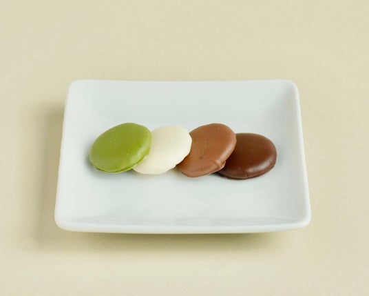 ■チョコふやき4枚 ¥440京菓子の世界で親しまれてきた麩焼きせんべいを、4種のチョコレートで包みました。軽やかな食感とやさしい米の甘みが特長です。