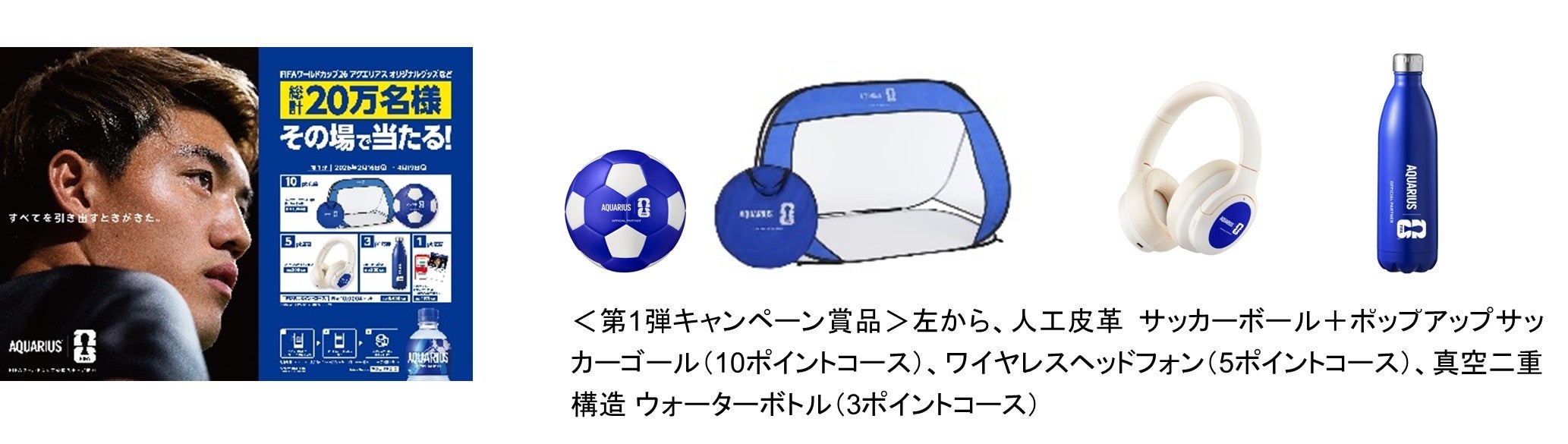 これに伴い、FIFAワールドカップ26アクエリアス オリジナルグッズなどをプレゼントするキャンペーンを実施します。対象製品のラベルの二次元コードをスマートフォンで読み込むと、貯めた抽選ポイント数に応じて抽選で総計20万名様(第1弾)にサッカー用品などのオリジナルグッズやデジタルポイントがその場で当たります。