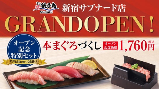 グランドオープンを記念して期間限定の「本まぐろづくし」を販売いたします。本まぐろを存分に堪能できる特別セットです。販売店舗: すし銚子丸 Shinjuku 新宿サブナード店 ※店内飲食限定