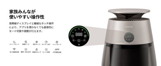 本体ディスプレイにより、空気質をリアルタイムで表示。さらに専用アプリ「Dreamehome」にも対応し、外出先からの確認や操作、フィルター管理なども可能です。