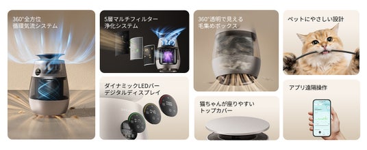 ・主な特長: 360°吸引/5層フィルター/透明ヘアキャッチボックス/空気質リアルタイム表示/アプリ対応