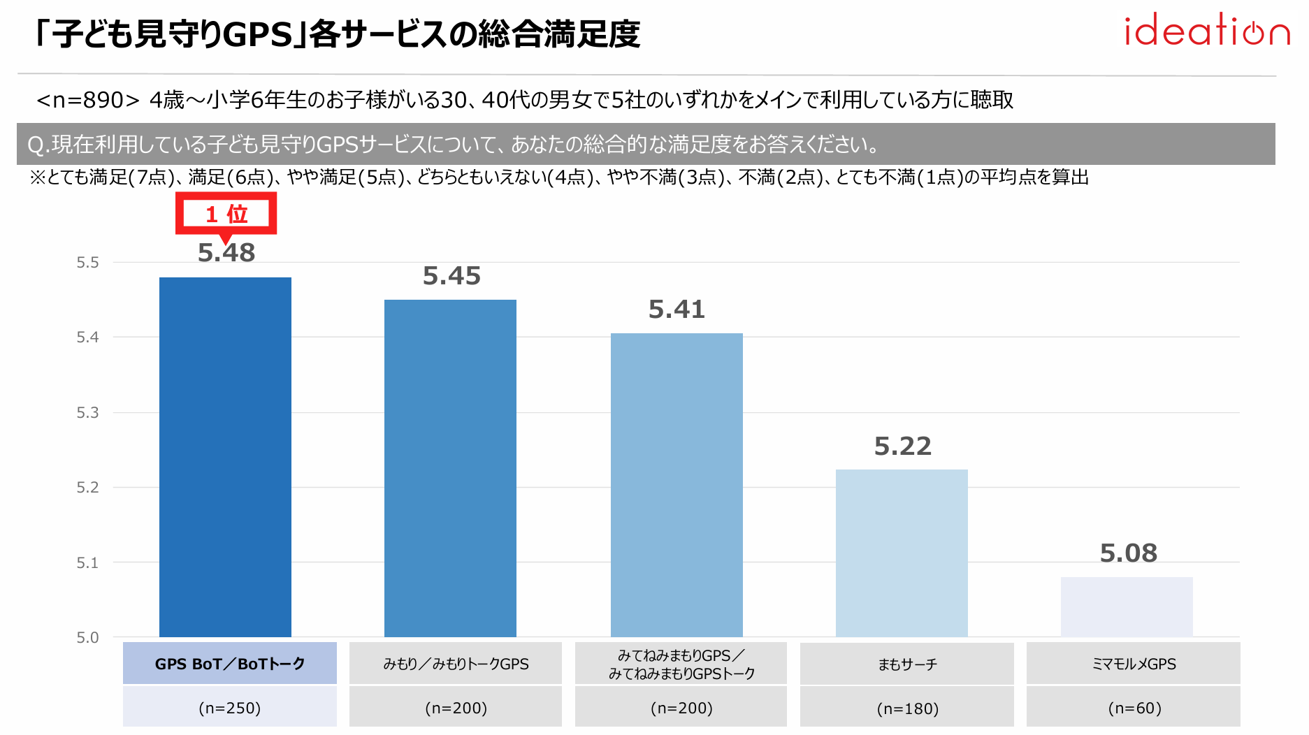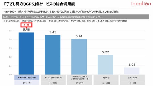 各サービスの総合満足度については、とても満足、満足、やや満足、どちらともいえない、やや不満、不満、とても不満の7段階で質問し、平均点を算出した結果、「GPS BoT/BoTトーク」(5.48点)が1位となり、他サービスと比較して、満足度が高いことが見て取れる。