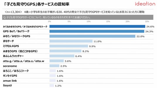 各サービスの認知率は、1位が「みてねみまもりGPS/みてねみもりGPSトーク」(24.6%)、2位が「GPS BoT/BoTトーク」(24.3%)、3位が「みもり/みもりトークGPS」(22.0%)、4位がまもサーチ(11.0%)、5位がミマモルメGPS(9.9%)と、上位3サービスは20%台と比較的高い認知を獲得しており、4位・5位も約10%前後の認知率となっている。