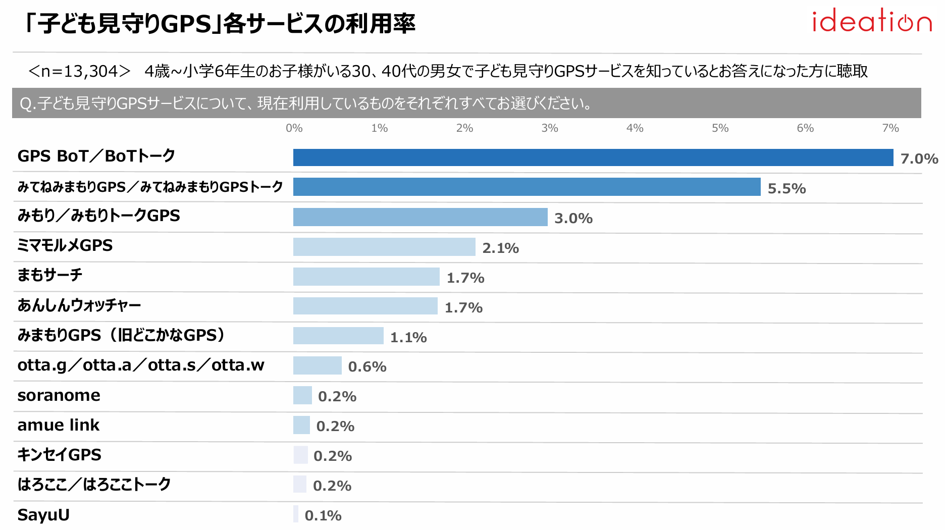 各サービスの利用率は、5年連続「GPS BoT/BoTトーク」(7.0%)が1位、「みてねみまもりGPS/みてねみもりGPSトーク」5.5%)が2位となった。