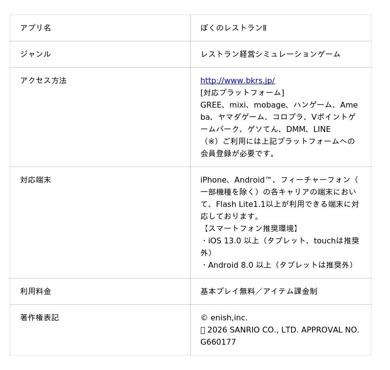 株式会社enish(本社:東京都港区、代表取締役社長:安徳 孝平、以下enish)が提供する大人気レストラン経営シミュレーションゲーム『ぼくのレストランII』は、株式会社サンリオ(本社:東京都品川区)とのライセンス契約により『サンリオキャラクターズ』のガチャを、2026年2月11日(水)から3月9日(月)まで期間限定で開始いたしました。