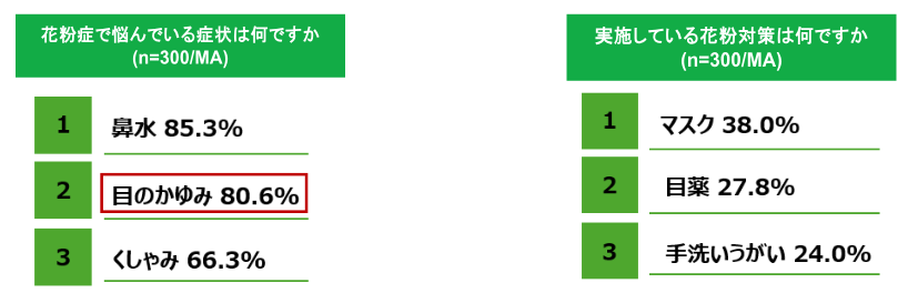- 花粉症の悩みとして8割以上が「目のかゆみ」を訴える結果に。