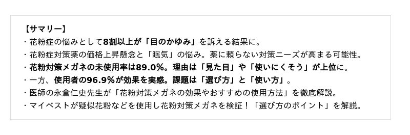 - 花粉対策メガネの未使用率は約9割。理由は「見た目」や「使いにくそう」が上位に。