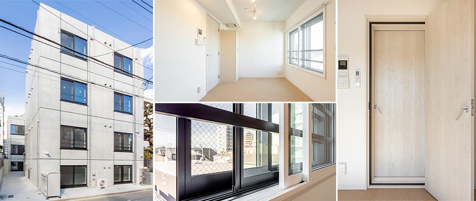 写真左:賃貸レジデンス「ラシクラス西落合」外観、中央上:防音仕様の居室(3重サッシと2重扉を採用)中央下:高い遮音性を実現する3重サッシ、右:音を抑える2重扉