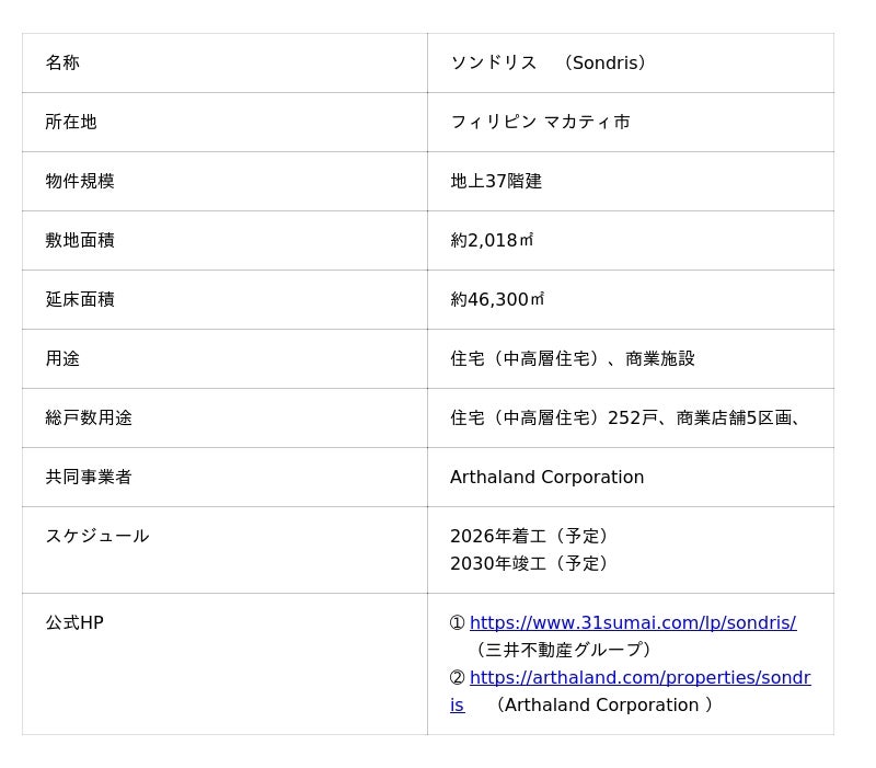 三井不動産株式会社(所在:東京都中央区、代表取締役社長:植田 俊、以下、「当社」)は、Mitsui Fudosan (Asia) Pte. Ltd.(三井不動産アジア株式会社、所在地:シンガポール)が100%出資しているフィリピン企業「SEAIメトロ・マニラ・ワン」を通じて、フィリピン・マニラ首都圏マカティ市における中高層住宅分譲事業「ソンドリス」(以下「本事業」)に参画したことをお知らせいたします。本事業は分譲住宅252戸、商業店舗5区画の複合開発事業です。本事業が加わり、当社のフィリピンでの事業は計2事業となります。