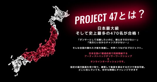 この理念のもと始動した「PROJECT 47 JAPAN」は、日本全国47都道府県から必ず1名ずつ、合計47名の合格者を選出する、史上最大級のオンラインダンスオーディションです。