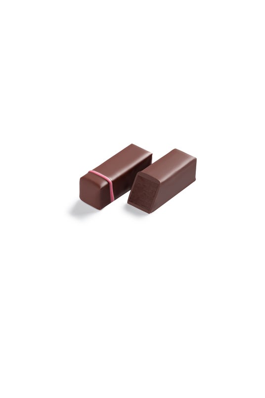 3種のピスタチオペーストをブレンドしたガナッシュを、ミルクチョコレートで包み込みました。力強さ、フルーティーな香り、長く続く余韻が、なめらかでやさしい味わいを生み出します。斜めにすっと入ったグリーンのラインが、洗練された印象を添えています。