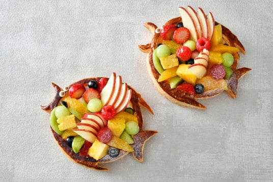 リンゴ、キウイ、オレンジ、メロン、イチゴなど、色とりどりのフルーツを贅沢に飾った新作です。リンゴの飾り切りで魚らしさあふれるデザインに仕上げました。やさしい甘さのカスタードクリームとパイ生地との相性も抜群の美味しさです。