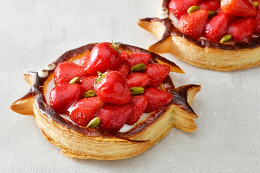 色鮮やかに艶めく旬の苺をたっぷりとトッピングした、定番の一品です。サクサクのパイ生地と苺の酸味、優しい甘さとなめらかな口当たりが魅力のカスタードクリームが絶妙にマッチした、甘さと酸味のバランスが魅力です。