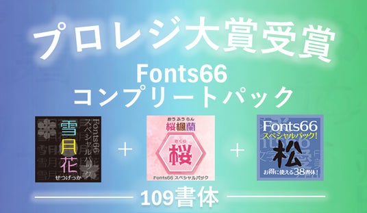 「Fonts66コンプリートパック/109書体」は、Windows標準フォント『メイリオ』を手がけた書体デザイナー、鈴木竹治氏によるフォントブランド「Fonts66」シリーズの全書体を収録したフォントセットです。以下、3つのフォントパック計109書体を同梱しています。