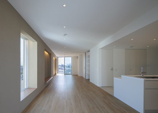 1フロア1住戸であることを活かし、共用部から居住空間へと緩やかに空間が連続する計画としています。水廻りとEVコアをひとつにまとめることで、L字型の大きなワンルーム空間を実現しました。また、キッチンとエントランスを一体的に構成することで、南北方向に広がる空間の自由度を高めています。
