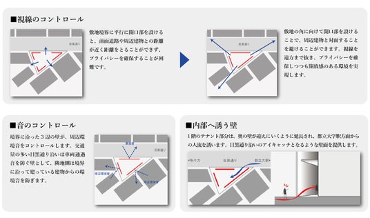 本物件では、三角形の特徴的な敷地に対して3辺それぞれに壁を設けるとともに、三角形の角は開口部を配置することで、内部環境を豊かにコントロールする建物を目指しました。壁を設けることで周辺の環境音を防ぎ、敷地の角に向けて開口部を設けることで、プライバシーを確保しつつも視線の抜けによって想像以上の部屋の広がりを感じる空間を実現いたします。また、1階店舗は奥の壁が都立大学駅方面からの人を迎えに行くように延長されています。