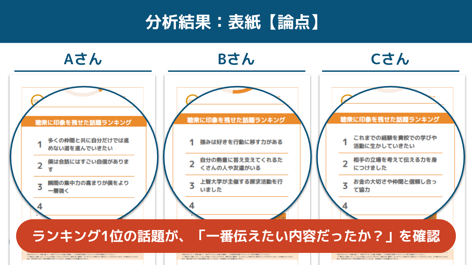 自己PRやプレゼンテーションにとどまらず、探究学習、ディスカッション評価、教員研 修などへの応用で、教育現場での活用を拡大も考えられます。定性情報を定量化すること で、努力が正当に評価される環境を構築し、データに基づく成長支援を実現してまいります。