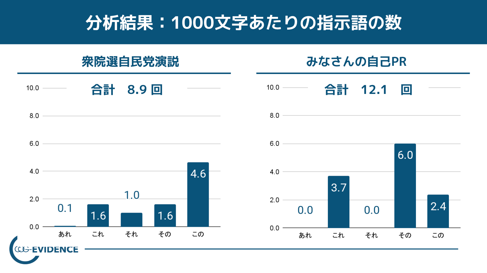 次に、フィラー(不要語句)の検出結果をグラフで提示しました。自己PRではフィラー がほとんど検出されず、練習の成果が客観的に裏付けられる結果となりました。一方で、指 示語(これ・それ・あれ等)の検出回数を千文字あたりで算出したところ、抽象度の高い表 現が一定数存在することが明らかになりました。具体性を高める改善余地が、数値として可 視化されました。