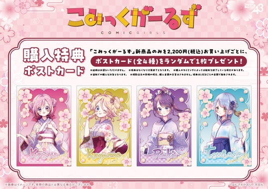 通販、または店頭で『アイドルビーバック!』&『こみっくがーるず』の新作グッズのみをそれぞれ1会計2,200円(税込)お買い上げごとに、購入特典として作品ごとのポストカード(全4種)をランダムで1枚プレゼントします。