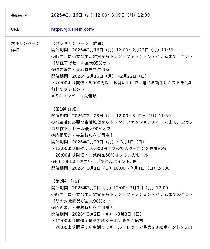 生活雑貨、美容アイテムからトレンドファッションアイテムまで最大90%オフ!SHEINで春の準備をもっとお得に【キャンペーン期間】2026年2月16日(月)12:00~3月9日(月)12:00まで