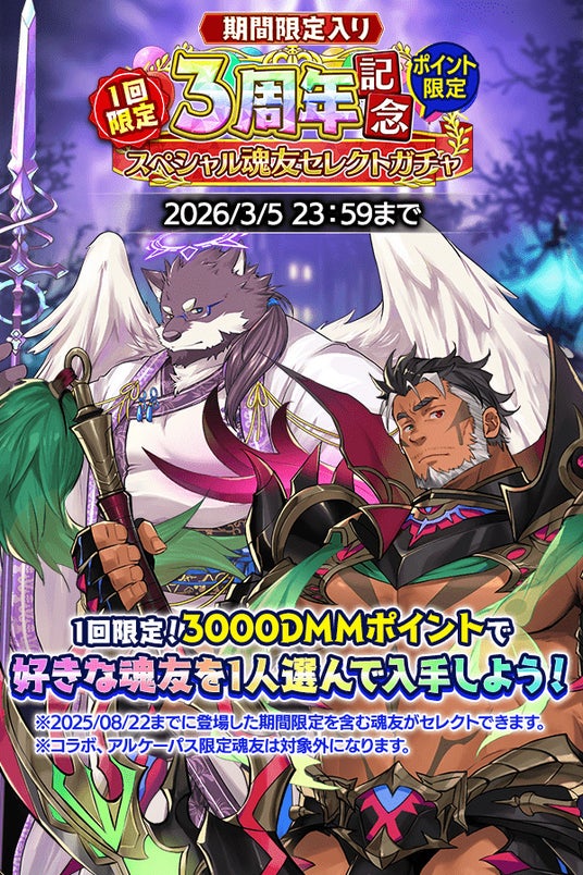 2025年8月22日までに登場した天使悪魔シリーズ、章限定キャラクターを含む『魂友』キャラクターから1体セレクトして入手できるおトクなガチャです。