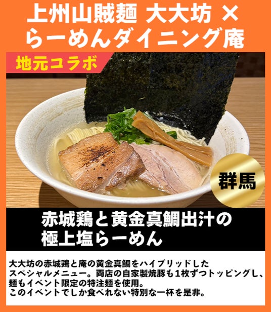 都内で人気の“いつか行きたかった”行列店、“一度は食べるべき”老舗の名店からSNSで話題の一杯まで、“うまい一杯”が高崎に一堂に会し、地元・群馬で愛される超人気店たちの奇跡のコラボ企画も見逃せません。2週目以降もご期待ください。