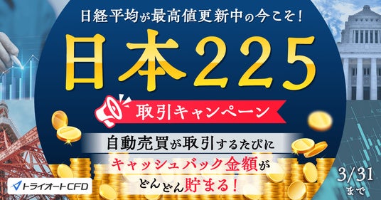 インヴァスト証券株式会社(本社:東京都港区、代表取締役社長:伊藤 誠規、以下「当社」)は、店頭CFD取引サービス「トライオートCFD」において、キャンペーン期間中に新規に稼働した日本225の自動売買での取引を対象に、0.1Lotあたり25円を上限なしにてキャッシュバックする「日本225取引キャンペーン」を、2026年2月16日(月)から3月31日(火)まで開催いたします。