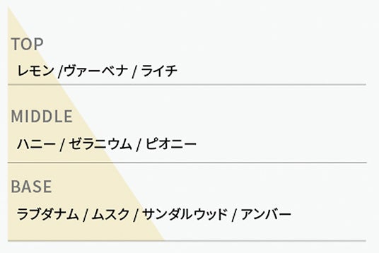 うっとりする甘さのハニーに、フレッシュなレモンをブレンド。ご褒美スイーツのような、ときめきと、ふわっと肩の力がぬけるような心地よさをもつ香り。