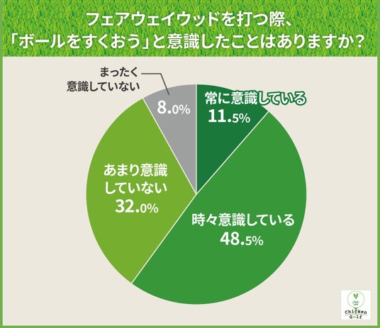 フェアウェイウッドの打ち方について、「常に意識している(11.5%)」と「時々意識している(48.5%)」を合計すると、全体の60%がボールをすくおうと意識していることが分かります。