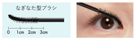 - 〈なぎなた型ブラシ〉を採用。ブラシ先端部のゆるやかなカーブが、まぶたに隠れたまつげの根もとにグッと入り込むため、目頭から目尻までの毛を残さずに塗ることができます。