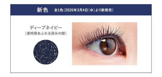 〈ディープネイビー〉は、「ブラックを感じるネイビーのベースカラー」を採用。ネイビーならではの洗練された印象と、ブラックをまとったようなパッチリとした目もとを両立します。「3色のパール(ブルー・イエロー・レッド)」をブレンドすることで、ベースカラーを際立てながらまつげに透明感をプラス。深みのあるカラーでありながら、重くならずにスッと抜けるようなパッチリとした目もとを叶えます。さらに、白目を澄んで見せ、洗練されたまなざしを演出します。