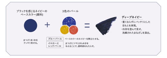- 「ブラックを感じるネイビーのベースカラー(顔料)」を採用。ネイビーの洗練さを感じさせながらも、ブラックのようなクッキリとした発色で、パッチリとした目もとを叶えます。