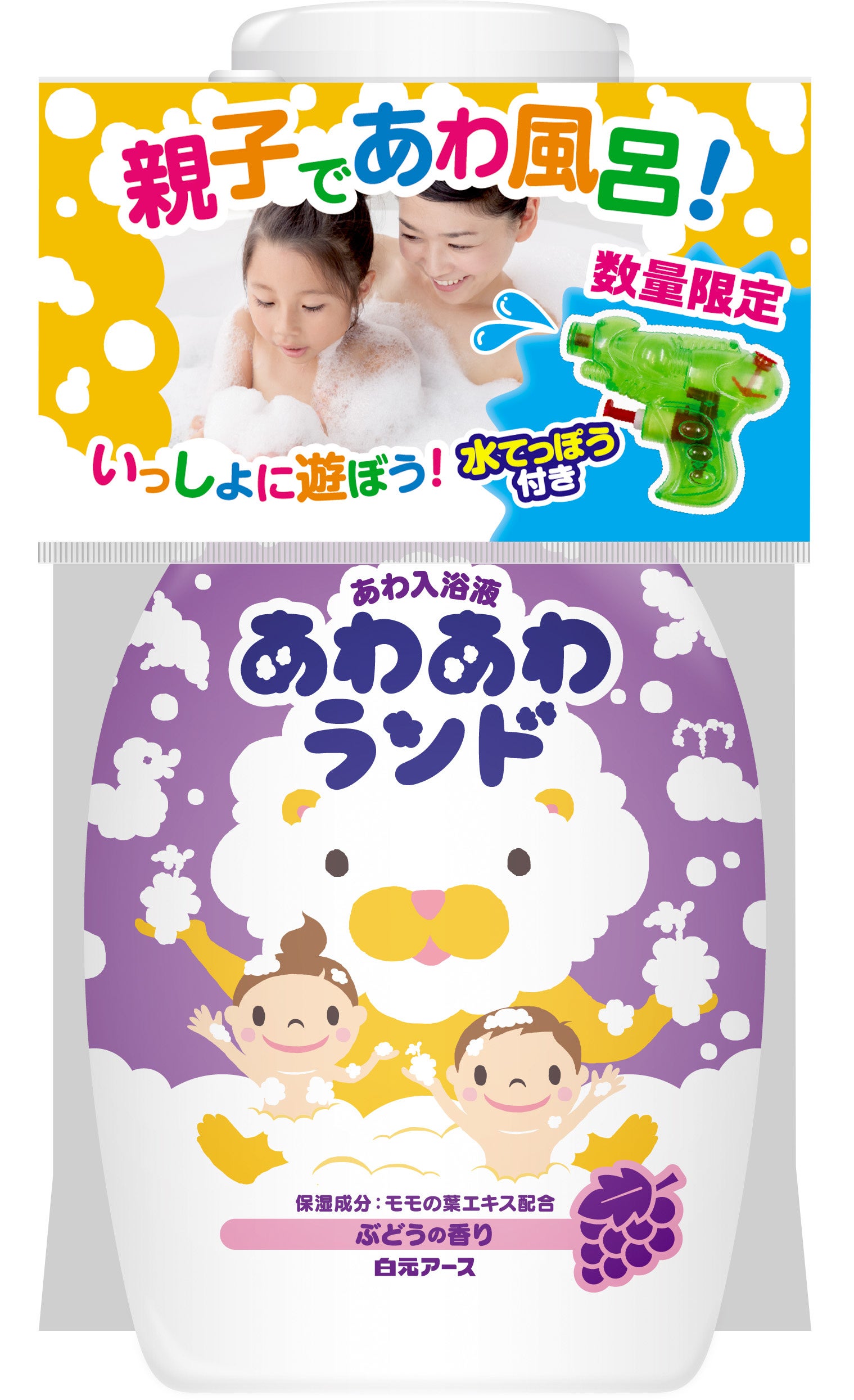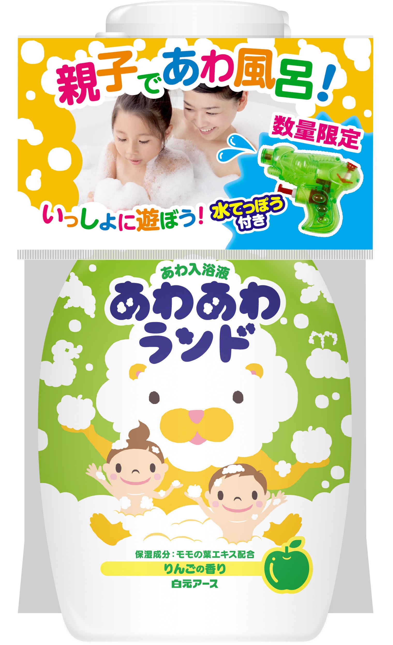 「あわあわランド」は親子の大切なコミュニケーションの場であるバスタイムが楽しくなる液体タイプの泡入浴液です。ご自宅で手軽にふわふわな泡のお風呂を楽しむことができます。今回、お子様にもっと楽しい時間を過ごしてもらうため、水てっぽうのおまけを付けた限定企画品を発売いたします。