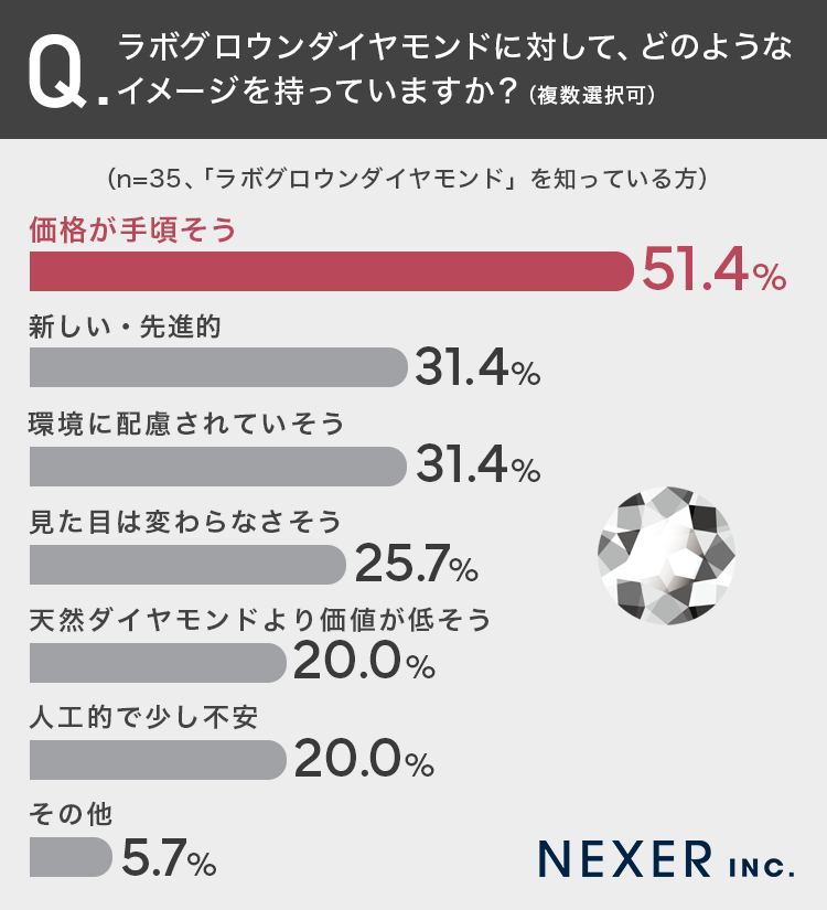 最も多かったのは「価格が手頃そう」で51.4%でした。半数以上の方が、天然ダイヤモンドと比べてリーズナブルな印象を持っていることがわかります。