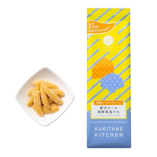 『15周年記念かきたね 贅沢チーズ海鮮風塩だれ』は、15年間人気上位を誇る「贅沢チーズ」と「海鮮風塩だれ」を組み合わせたら、これまでにない“最強のハッピーフレーバー”が生まれるのではないか。そんなアイデアから誕生しました。