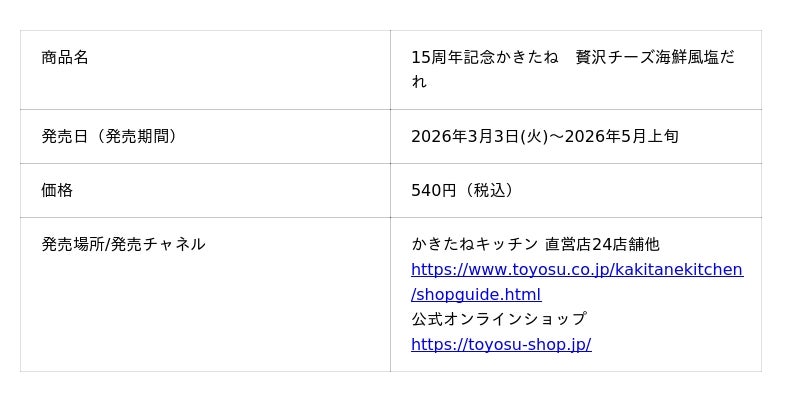 とよす株式会社(本社:大阪府池田市 社長:眞田 昌彦)は、百貨店を中心に展開しているブランド「かきたねキッチン」において、『15周年記念かきたね 贅沢チーズ海鮮風塩だれ』を2026年3月3日(火)から期間限定で発売いたします。