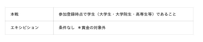 学生のみが参加できる「本戦」と、学生以外でも参加可能な「エキシビション」の二つの参加枠があります。