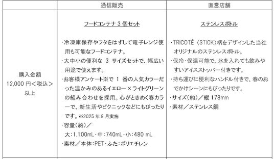 ◆実施内容:通信販売、直営店舗での購入金額に応じて以下をプレゼントします。