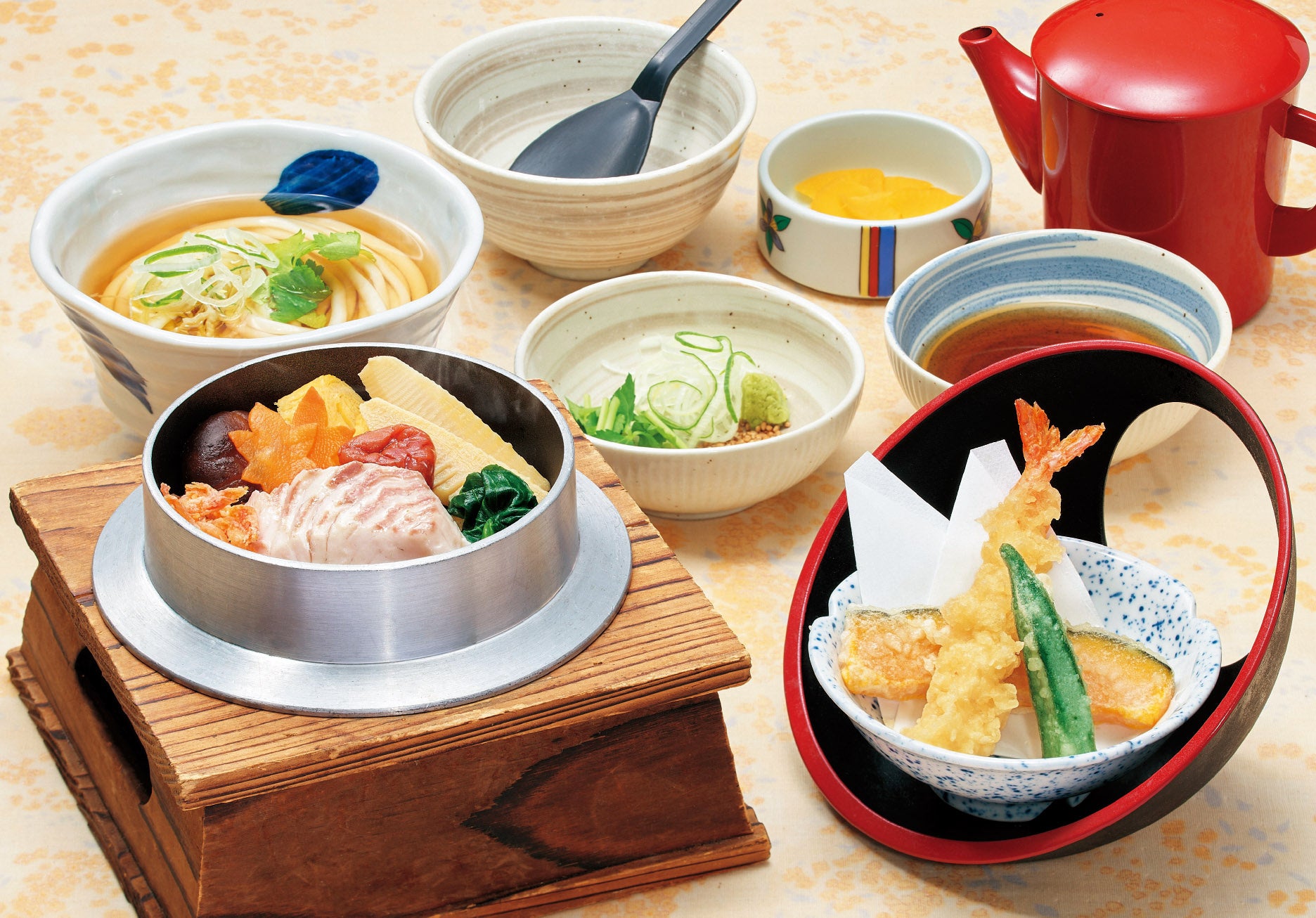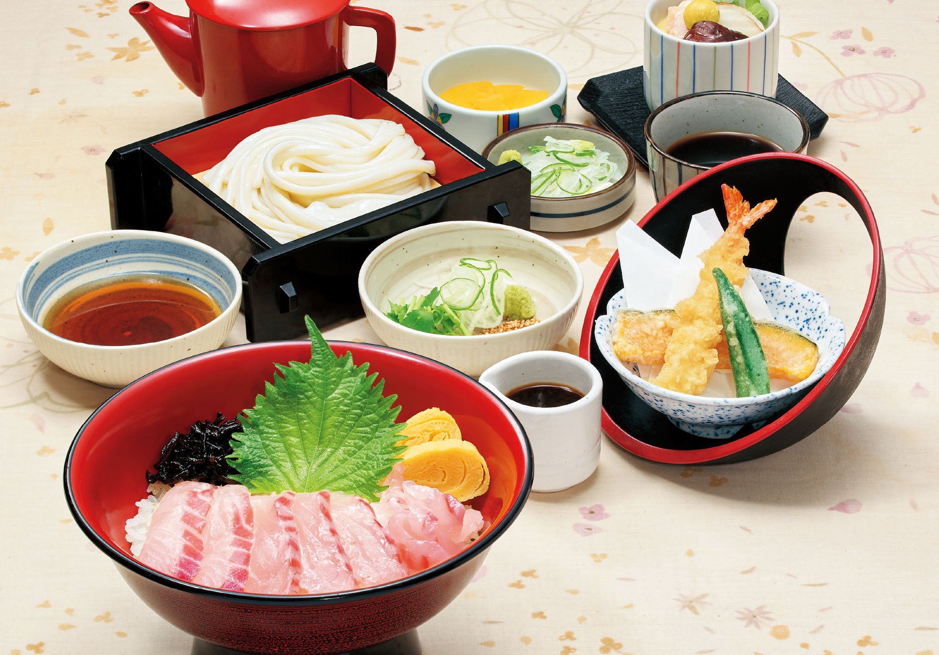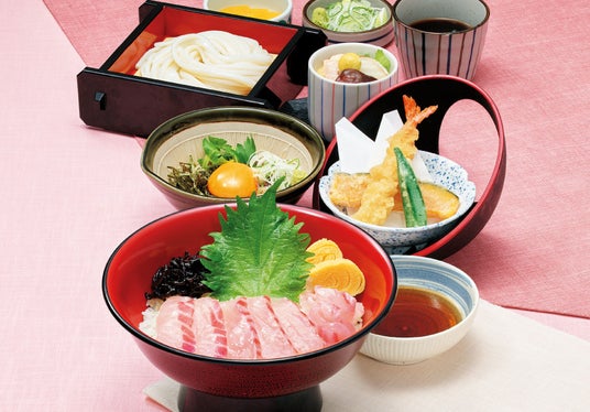海苔と梅の特製たれ『鯛めし御膳』(うどん・天ぷら・茶わん蒸し付)