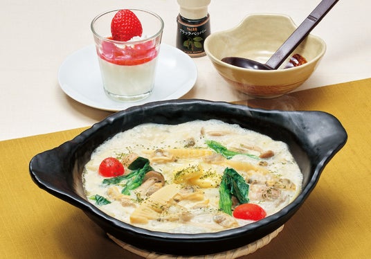 蒸しあさりをたっぷりと使用したクラムチャウダースープに、竹の子・菜の花を中心とした春野菜ともちもちの手延べうどんを合わせた和洋折衷の一杯です。あさりの旨みと野菜の甘味が広がる味の民芸ならではのやさしい一杯です。