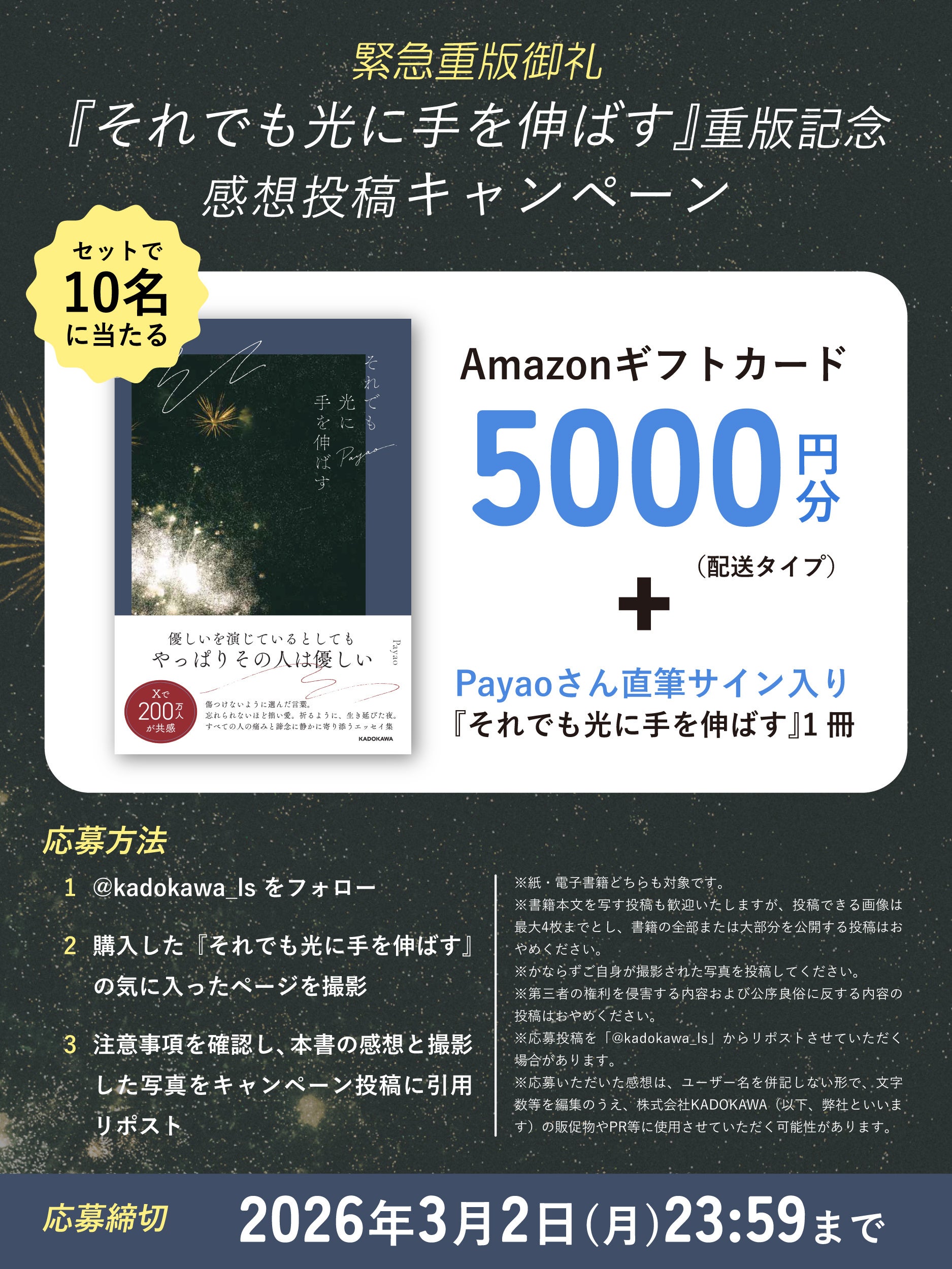 重版を記念し、X(旧Twitter)にて感想投稿キャンペーンを実施します。KADOKAWAライフスタイル編集部公式アカウント「@kadokawa_ls」をフォローのうえ、本書の感想とお気に入りページの写真を引用リポストで投稿いただいた方の中から、抽選で10名様にAmazonギフトカード5,000円分とPayaoさん直筆サイン入り書籍をプレゼントいたします。