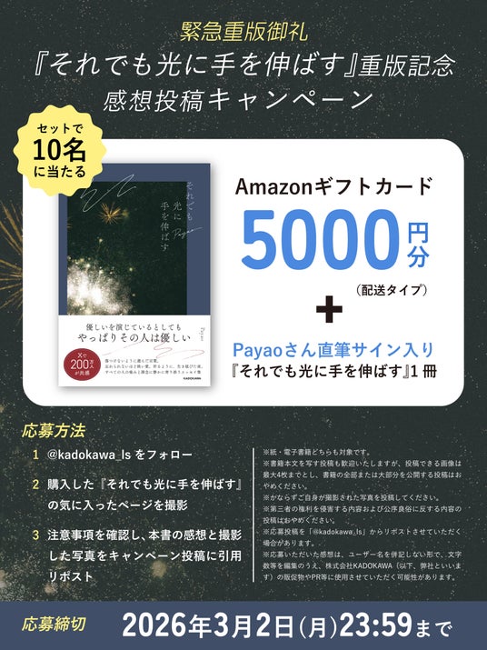 株式会社KADOKAWA(本社:東京都千代田区、取締役 代表執行役社長 CEO:夏野剛)より刊行されたエッセイ集『それでも光に手を伸ばす』(著者:Payao)が、発売2か月で累計発行部数2.2万部を突破いたしました。