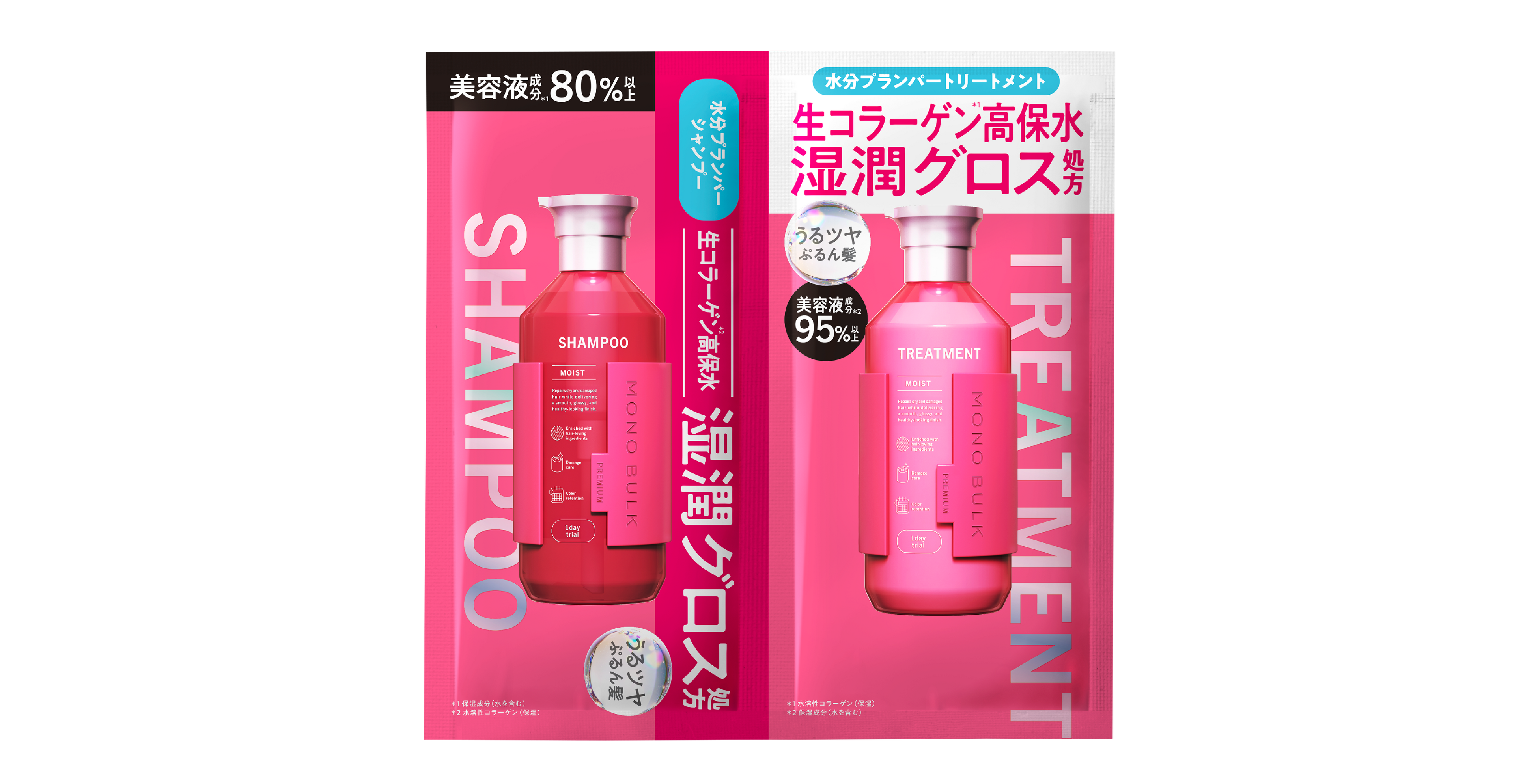 *水溶性コラーゲン(保湿) *1 補修成分による膜状構造 *2 保湿成分(水を含む) *3 髪内部のダメージのこと *4 セラミドNG、セラミドNP、セラミドAP、PG、ジステアリルジモニウムクロリド(全て保湿)/ クオタニウム−33(保湿)[モノバルク モイスト シャンプー、モノバルク モイスト ヘアトリートメントに配合]/コレステロール (保湿)[モノバルク モイスト ヘアミルク以外に配合] *5 ポリクオタニウム−64(保湿)、リピジュアは日油株式会社の登録商標です。[モノバルク モイスト ヘアオイル以外に配合 ] *6 傷んだ髪を選択的に補修すること/キトサンヒドロキシプロピルトリモニウムクロリド(保湿)[モノバルク モイスト ヘアオイル以外に配合] *7 ジマレイン酸シスタミン(保湿)[モノバルク シャンプー、モノバルク ヘアトリートメントに配合]/ジマレイン酸プロピレンジアンモニウム(保湿)[モノバルク モイスト ヘアオイル、モノバルク モイスト ヘアミルクに配合] *8 ケラチン(羊毛)(保湿) *9 モノバルク モイスト ヘアオイル、モノバルク モイスト ヘアミルクに配合 *10 ココイル加水分解コラーゲンK、ココイル加水分解ケラチンK(羊毛) *11 イソステアロイル加水分解ケラチン(羊毛)(保湿) *12 ポリクオタニウム-64、ジヒドロキシプロピルアルギニンHCl(全て保湿)