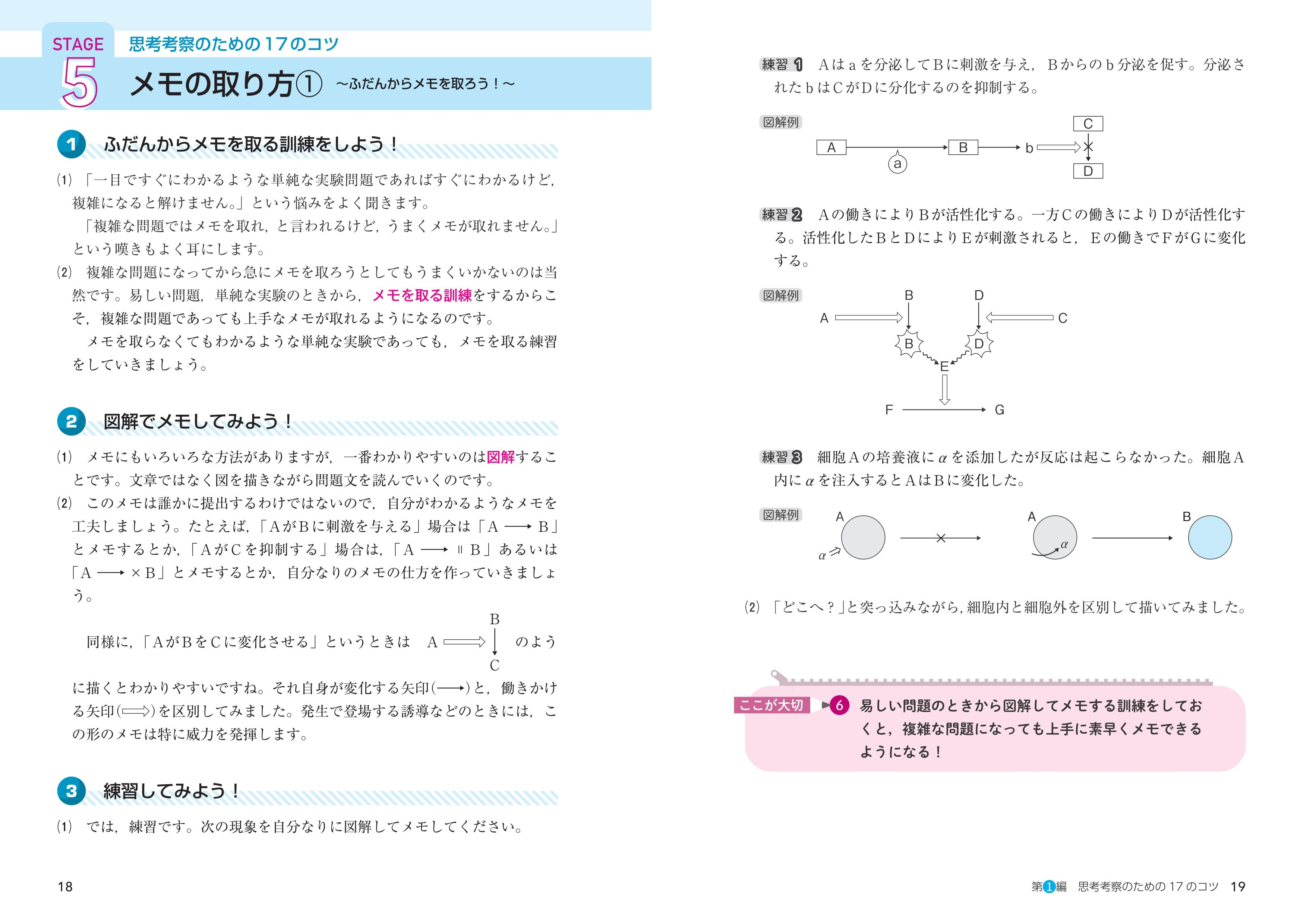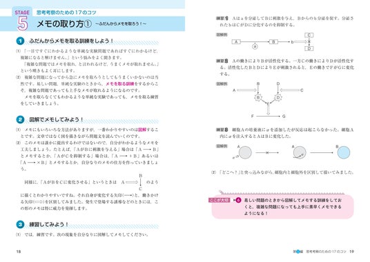 ・第1編「思考考察のための17のコツ」では、実験・考察問題への取り組み方、メモの取り方など、考え方のコツやルール、ノウハウがわかります。