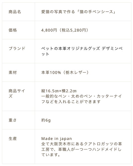 大阪府茨木市で革小物の製作・販売をする株式会社ガッツ(代表:中辻大也)は、2月22日猫の日に向けて「愛猫の写真で作る 猫の手ペンシース」を新発売。価格は4,800円(税込5,280円)ページはこちら https://pet.dezamin.com/nekonote-penseath/