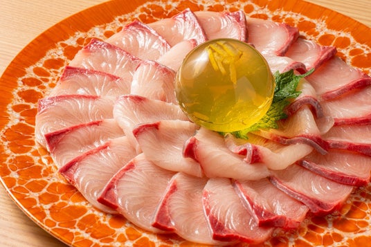 ブランド寒ブリ「鰤王」の刺身。中央のコラーゲンボールは、お客様自身で鍋に入れて楽しむ“体験型”の演出。※コラーゲンボールは演出として提供しており、効能を保証するものではありません。
