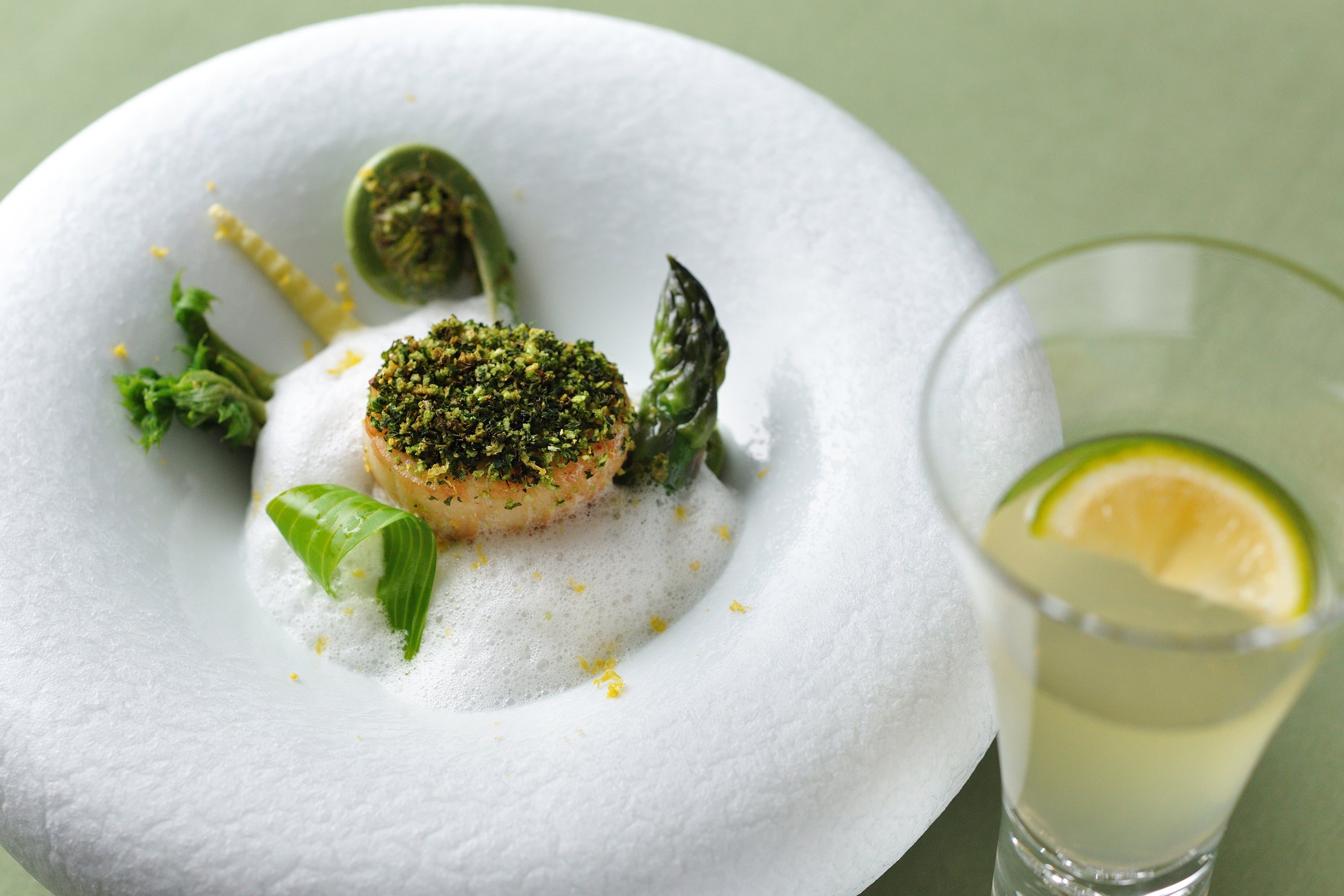アスパラガスや根曲がり茸など北海道ならではの春野菜を、魚介の旨みを凝縮した軽やかな泡が優しく包み込みます。その上に、香草パン粉とともに香ばしく焼き上げたホタテを盛り付けました。ホタテの柔らかな甘み、多彩な野菜の食感、そして魚介の旨み溢れる泡が一体となって、春の訪れを華やかに告げます。