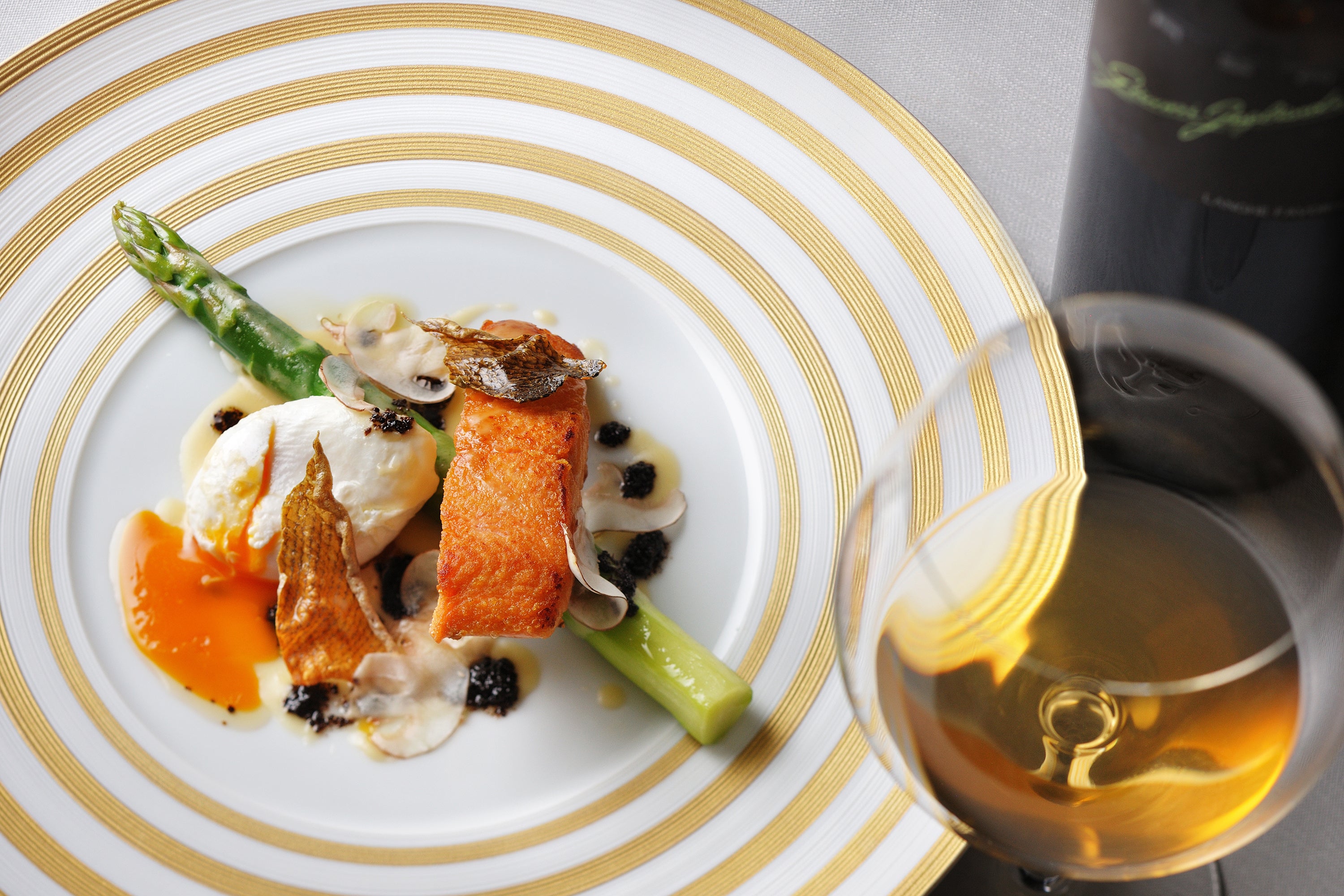 「サクラマスとアスパラミラネーゼ」×「カーザ・ランゲ・ファヴォリータ 2002」(ジャンニ・ガリアルド)
