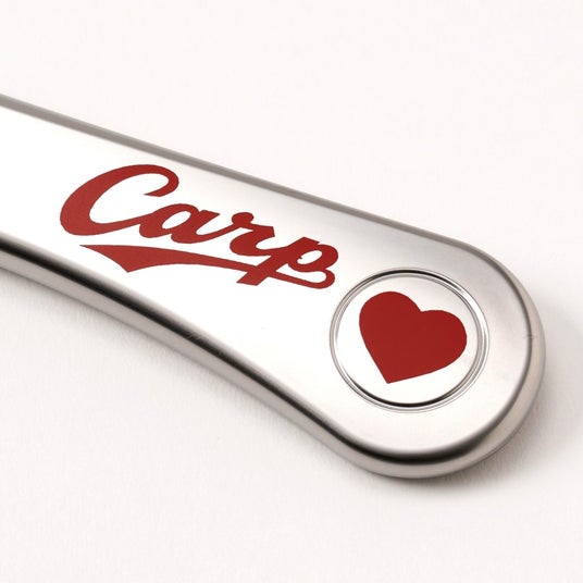 持ち手部分には、カープのロゴと可愛らしいハートマークを配置。さらに、柿原工業の所在地であり「ばらのまち」として知られる広島県福山市を象徴する「ばら」のワンポイントがあしらわれています。